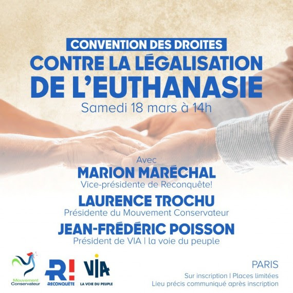 Laurence Trochu, présidente du Mouvement Conservateur, avec Madame Marion Maréchal, vice-présidente de Reconquête! et Monsieur Jean-Frédéric Poisson, président de VIA la voie du peuple, a l’honneur d’organiser une convention des droites contre la légalisation de l’euthanasie samedi 18 mars à Paris. Pour en parler, ils ont accueilli des experts, des juristes et des soignants qui ont tous été confrontés au sujet.