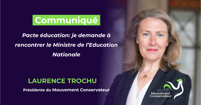Le Mouvement Conservateur, par la voix de sa présidente, Laurence Trochu, remercie le chef de l’Etat et le ministre de l’Education nationale pour les moyens supplémentaires qu’ils développement à l’adresse des enseignants. Il s’agit, en effet, d’un préalable indispensable pour revaloriser les enseignants et permettre à l’école de retrouver le chemin de l’excellence.